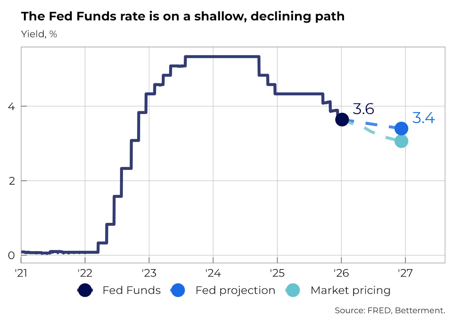As labor market conditions and inflation have slowed, gradually easing interest rates may help cushion the market. The Federal Reserve cut its policy rate by 0.25% in December, and may do so again in 2026. The chart below illustrates the expected path of the federal funds rate based on both the median projection of members of the Federal Open Market Committee and rates implied by the pricing of market futures contracts.