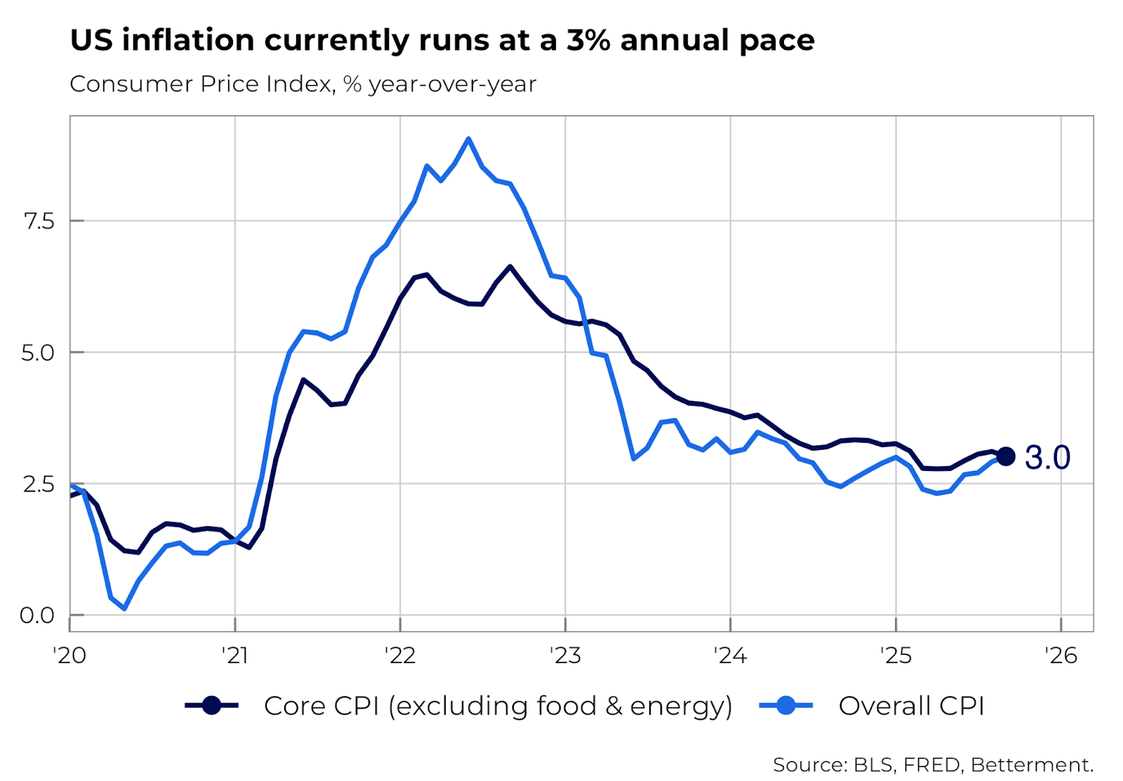 The good news: The trade war hasn’t caused a sharp spike in overall inflation. Prices are rising about 3% a year, which is still above normal—but much lower than the surge that followed the pandemic (as demonstrated in the chart below). In underlying data, we've seen the impact show up most in goods inflation, as opposed to services, where price increases have continued to moderate in the last several years.
